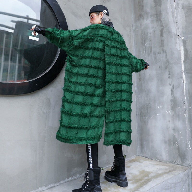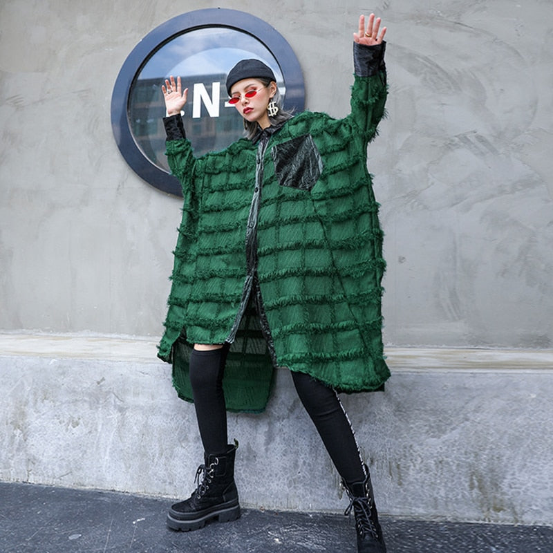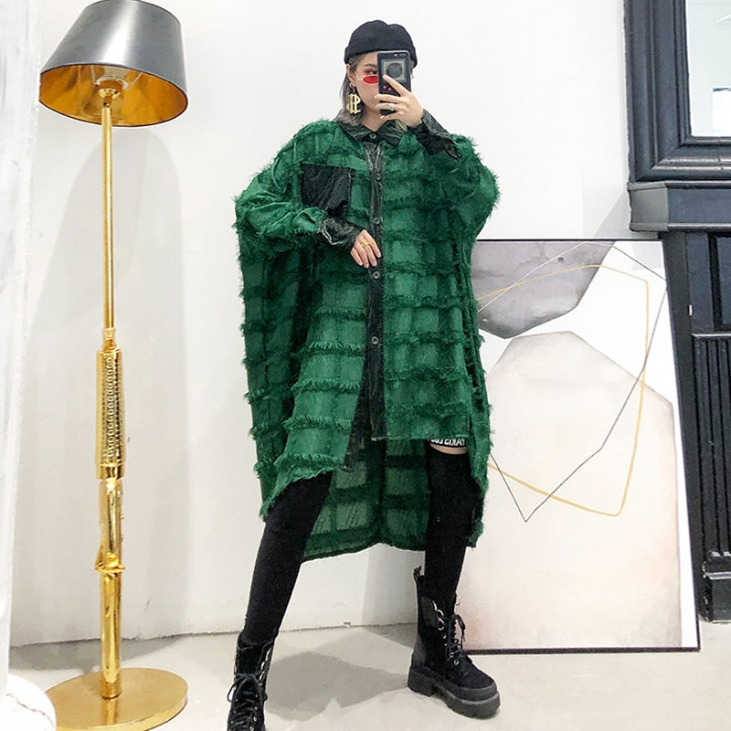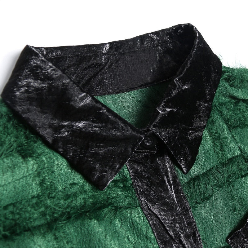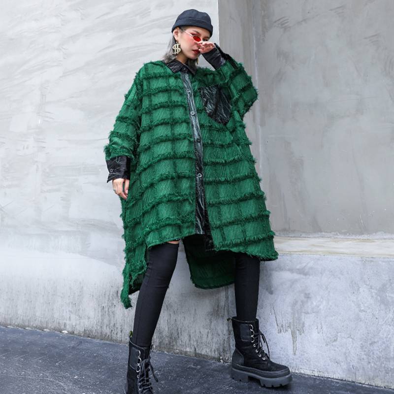 Abrigo verde asimétrico con cuello vuelto, patrón de patchwork, decoración de bolsillo y material de algodón y poliéster