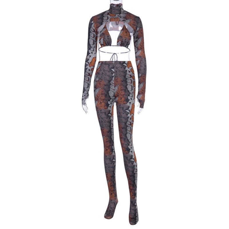 Conjuntos de pantalón de manga completa con estampado de cintura elástica y cuello alto de spandex