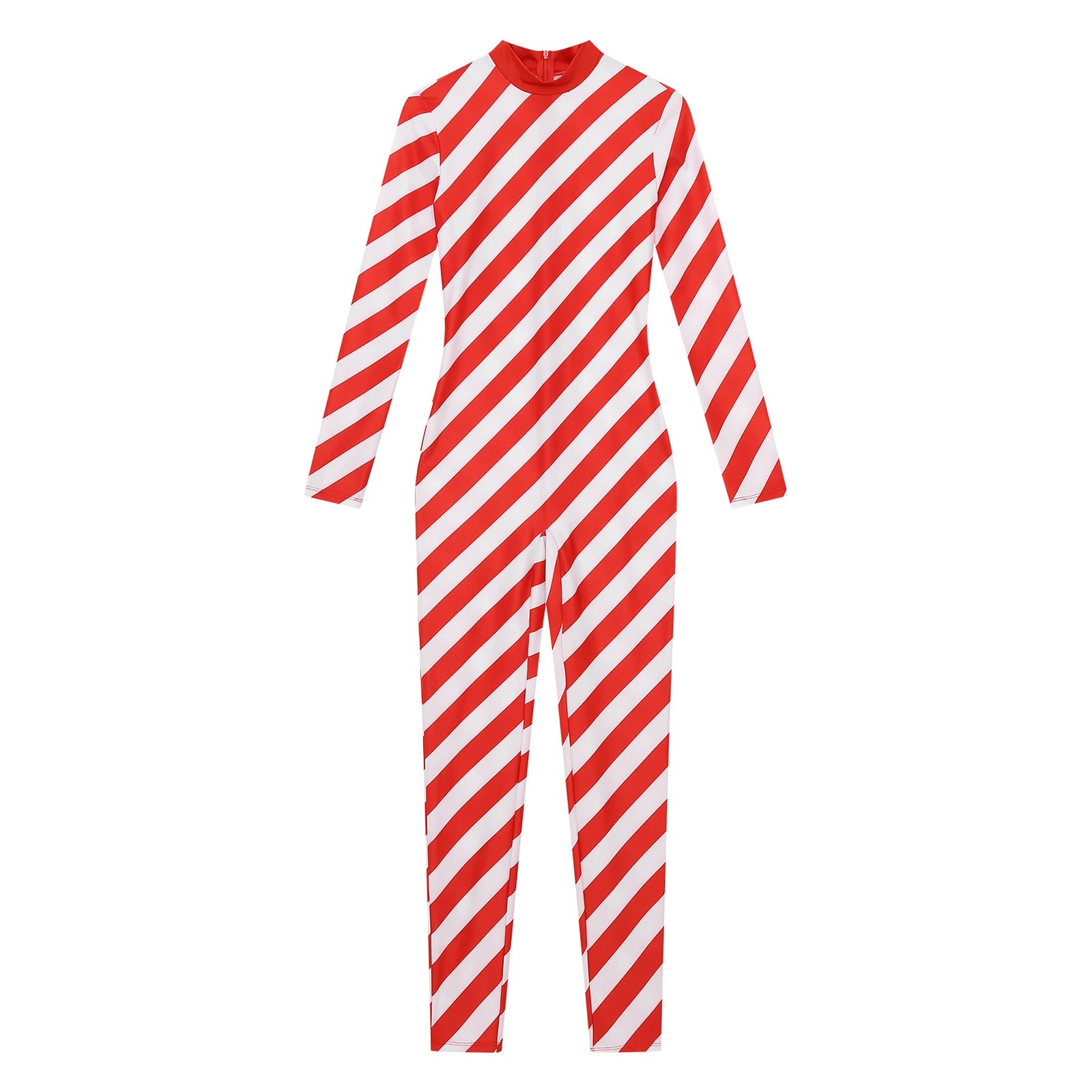 This classic, striped jumpsuit is made of comfortable Spandex for a festive, festive look. It features a full-length sleeve and a convenient zipper closure. Perfect for holiday parties or a cozy family get-together.