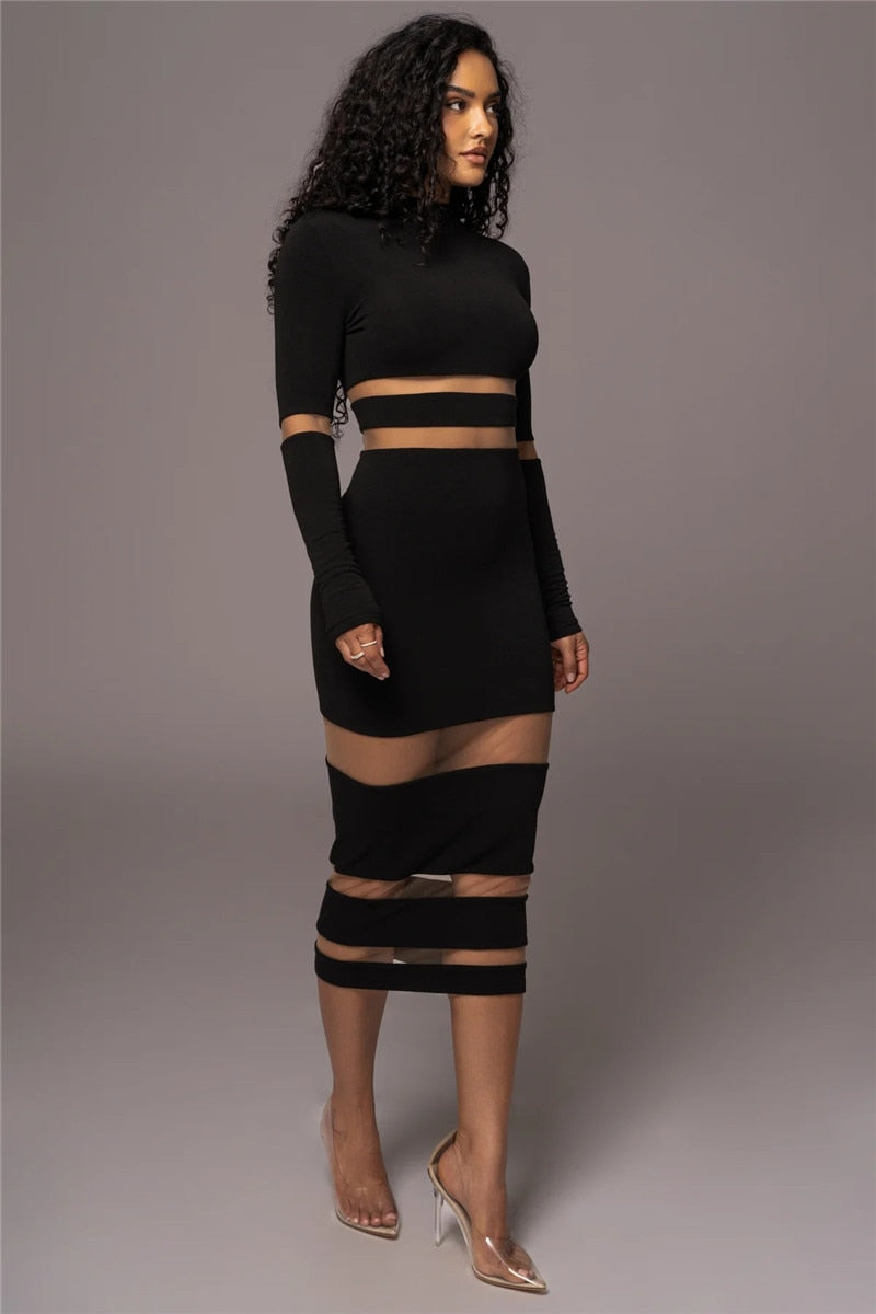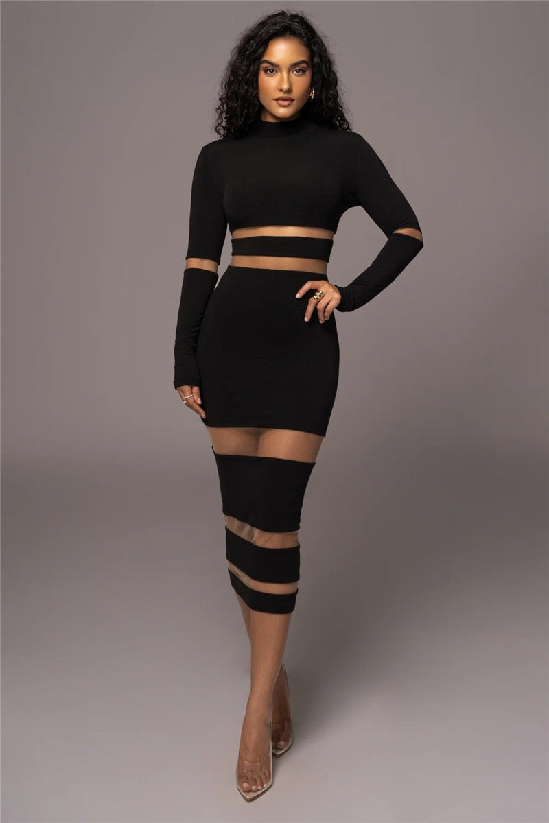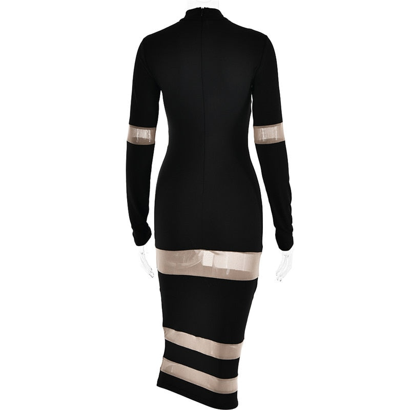 This midi dress is the perfect choice for an elegant yet edgy look. Constructed with solid fabric and detailed with a see-through mesh patchwork, this dress features long sleeves and a midi length for a classy and sophisticated finish.